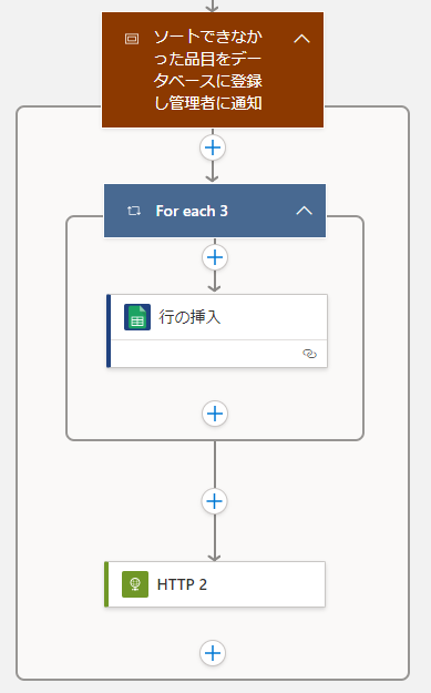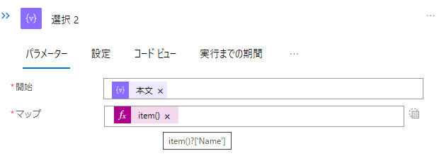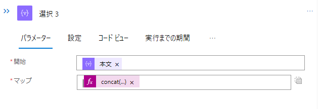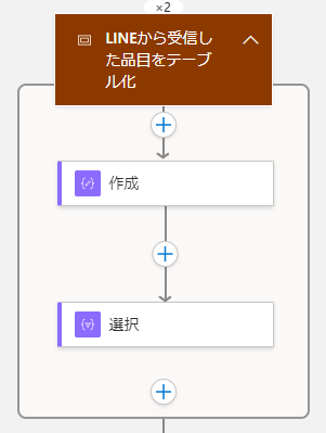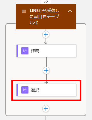 LINE から受信した品目ごとに処理するので、3-2. の最後のアクション「選択」の結果を For each のパラメータとして設定し、
