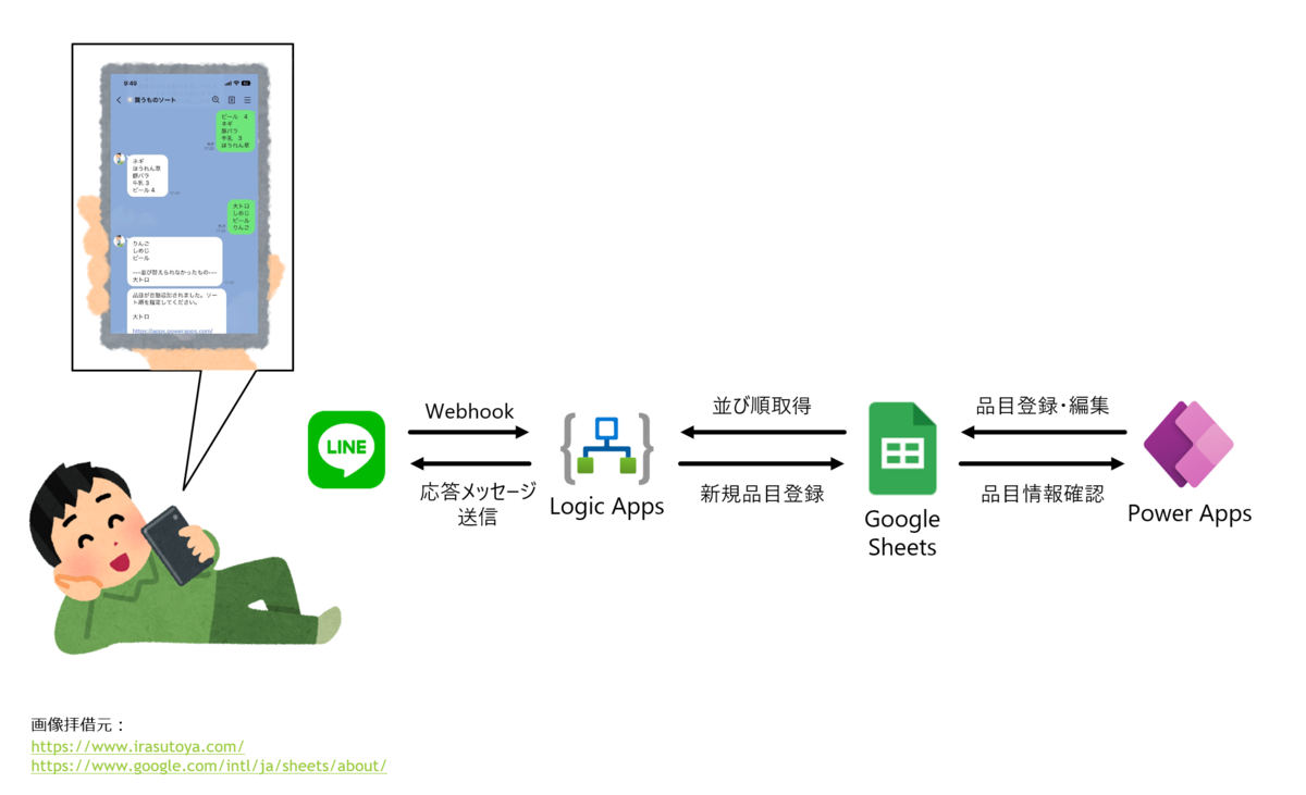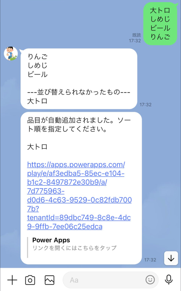 買い物メモを思い付きで入力すると、順番がぐちゃぐちゃになって買う時に読みづらいので、おおよそかごに入れる順番にソートしてくれる LINE ボットを作ってみた。#linedc#LogicApps pic.twitter.com/SJczGg73Ga