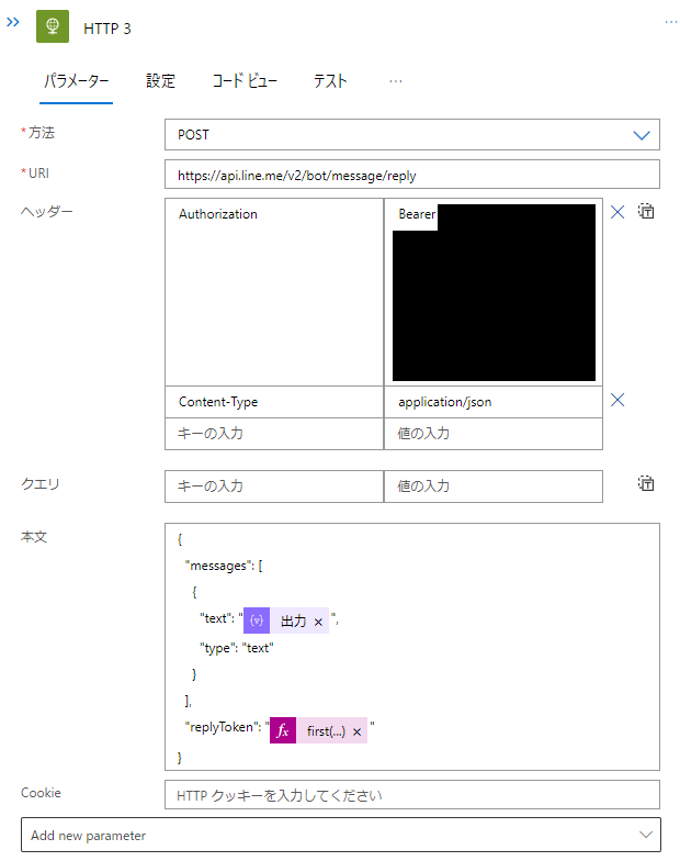 replyToken は以下のように指定することで、トリガの本文から取得できます。