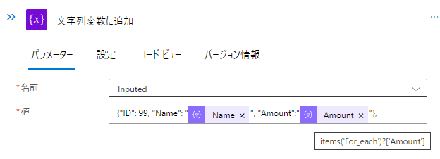 「文字列変数に追加」アクションでは、値に Amount を加えます。
